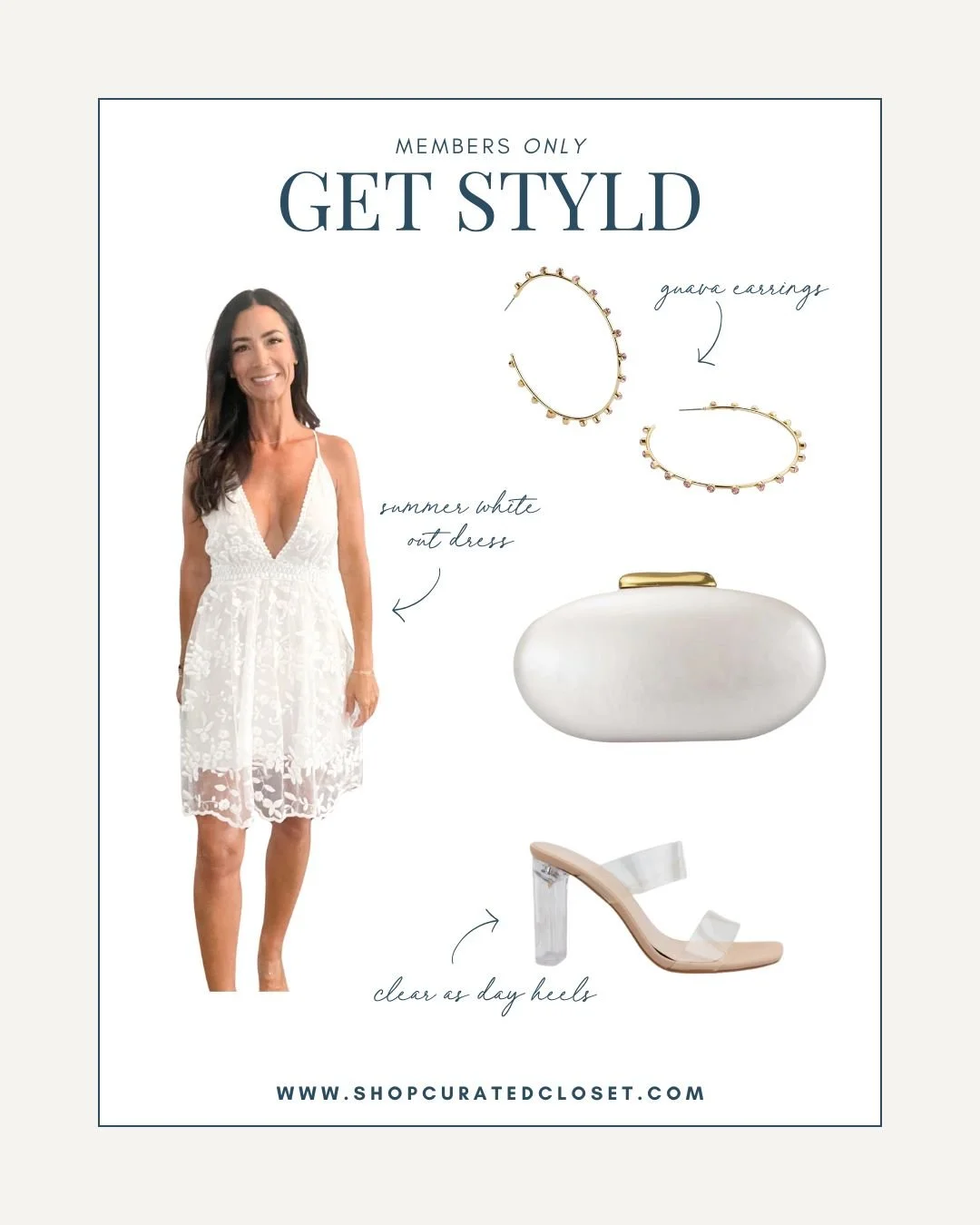 July - Look Three Jul 10 Written By Jennie Stehli Shop the full look at 25% off and receive free shipping on orders $100+Summer White Out Dress · clear as day heels · Guava Earrings Jennie Stehli